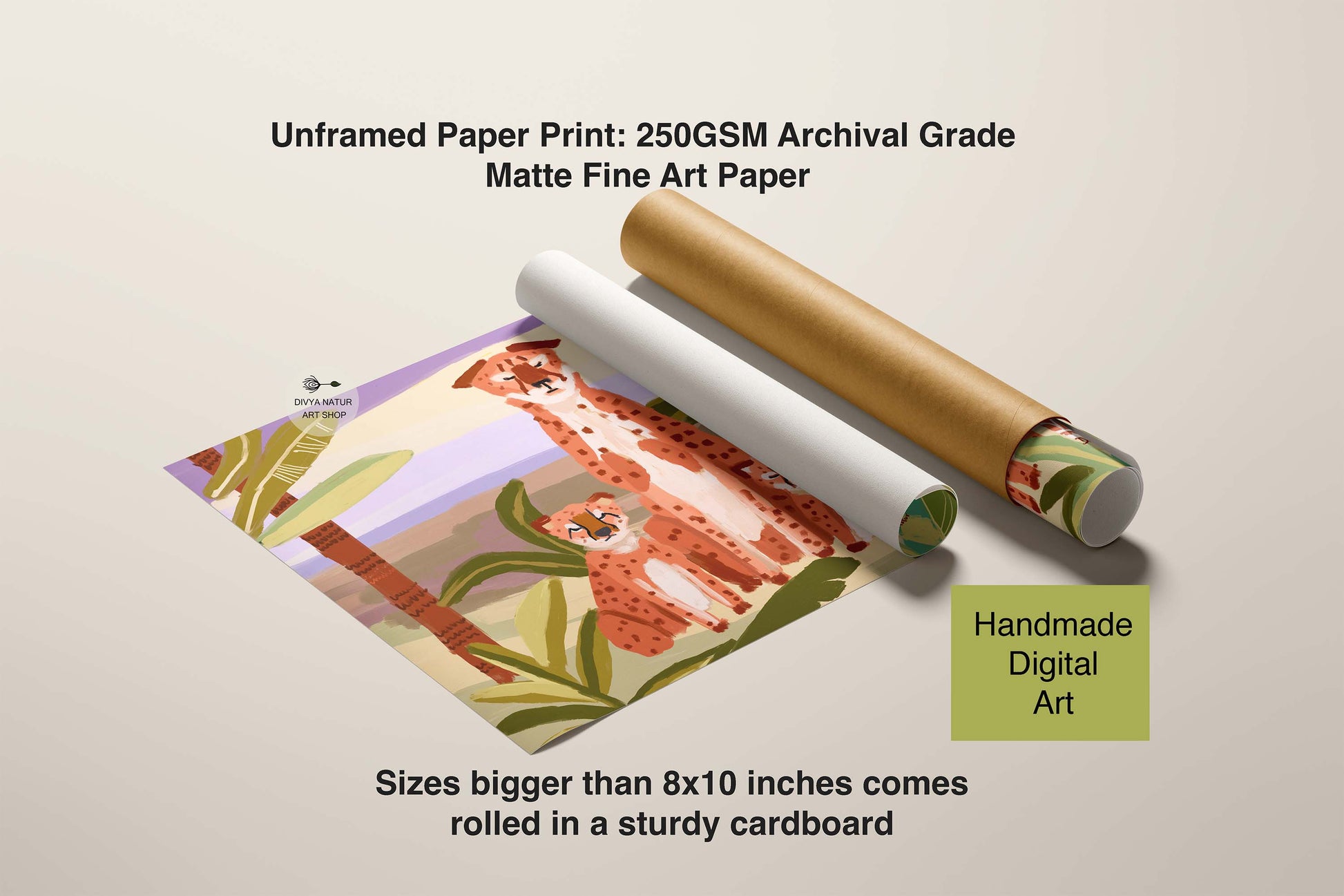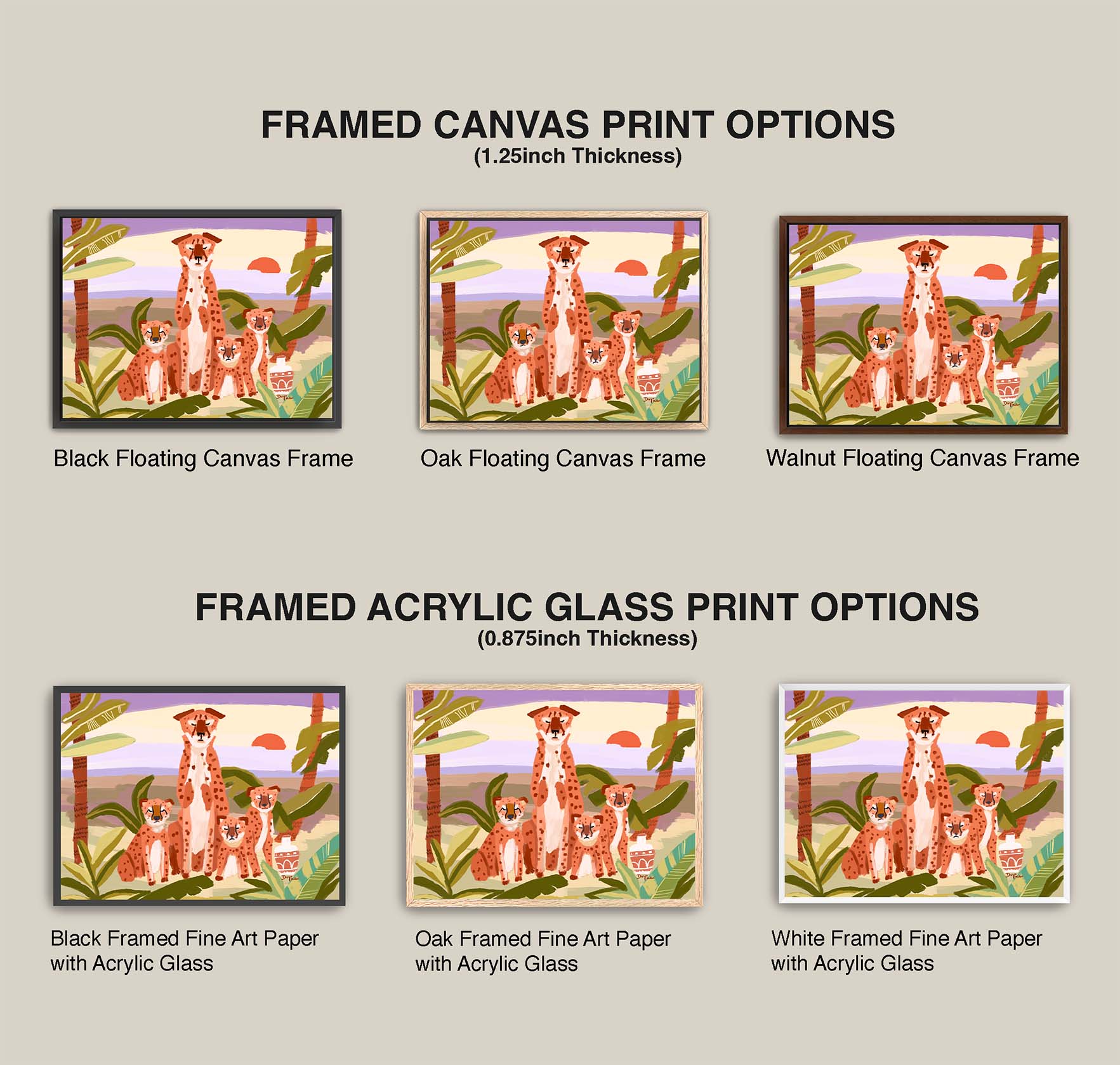 Bring the elegance of the savannah into your home with this Cheetah Family Fine Art Print. The artwork features a proud cheetah with three cubs gathered closely together, surrounded by tropical foliage and a glowing sunset sky painted in soft purples, oranges, and earthy greens.