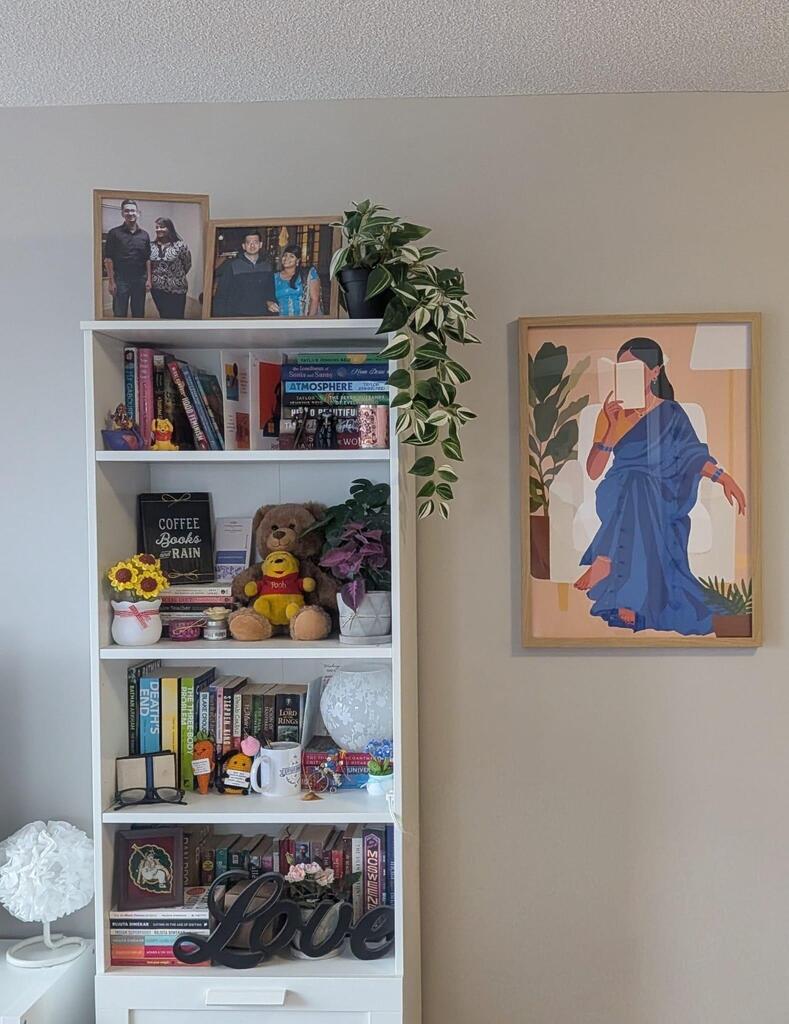 This elegant art print features an Indian woman in a deep blue saree, peacefully reading a book in a cozy home setting. Surrounded by plants and warm interiors, the illustration captures the essence of mindfulness, self-care, and cultural beauty.